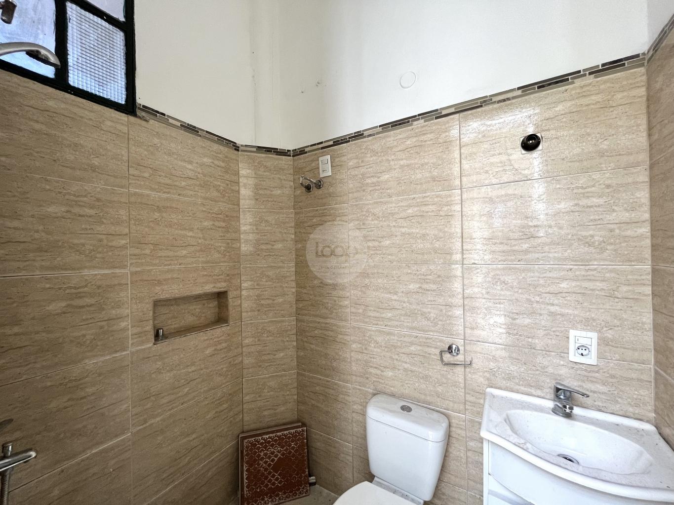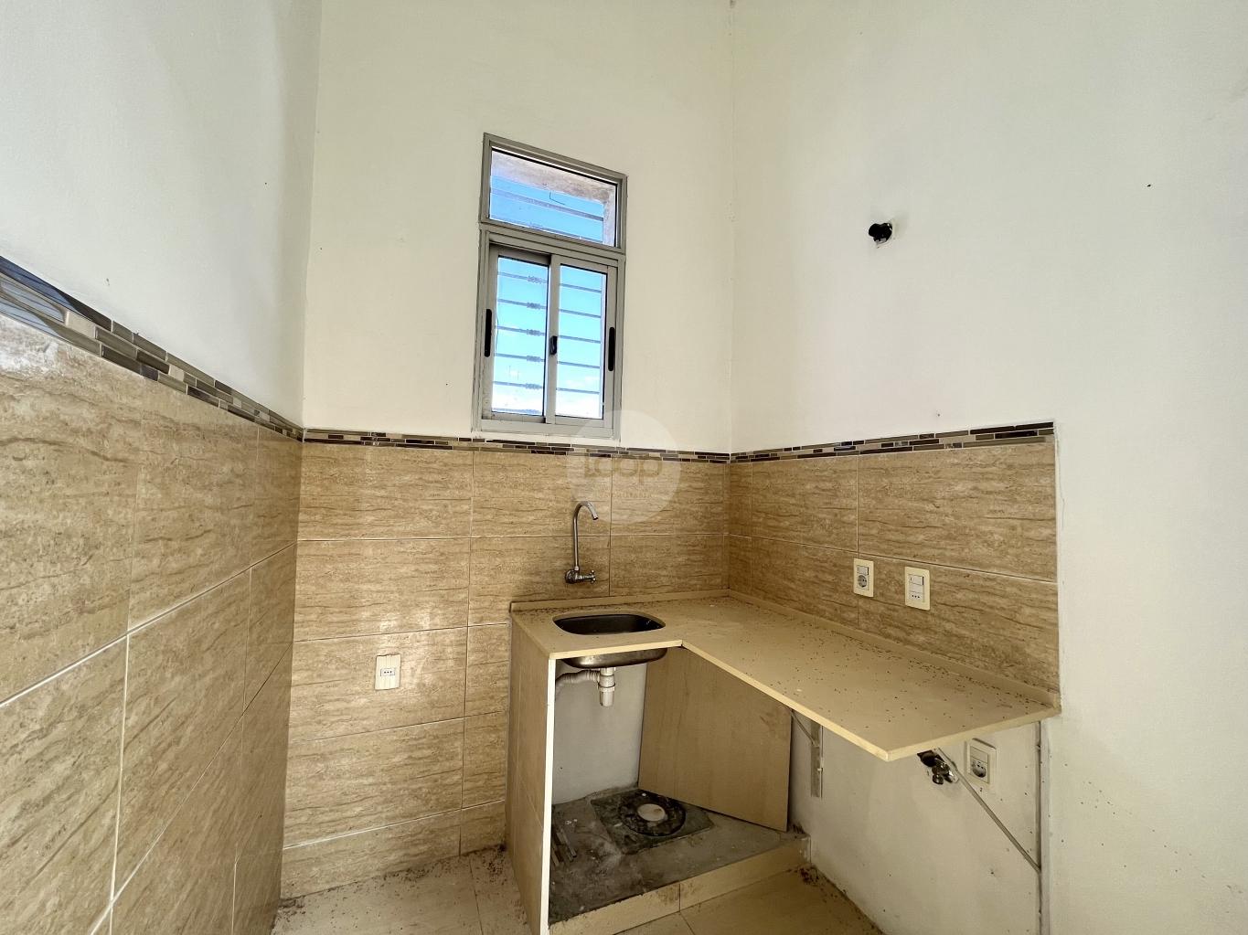 Baño completo cómodo y cocina definida pequeña.